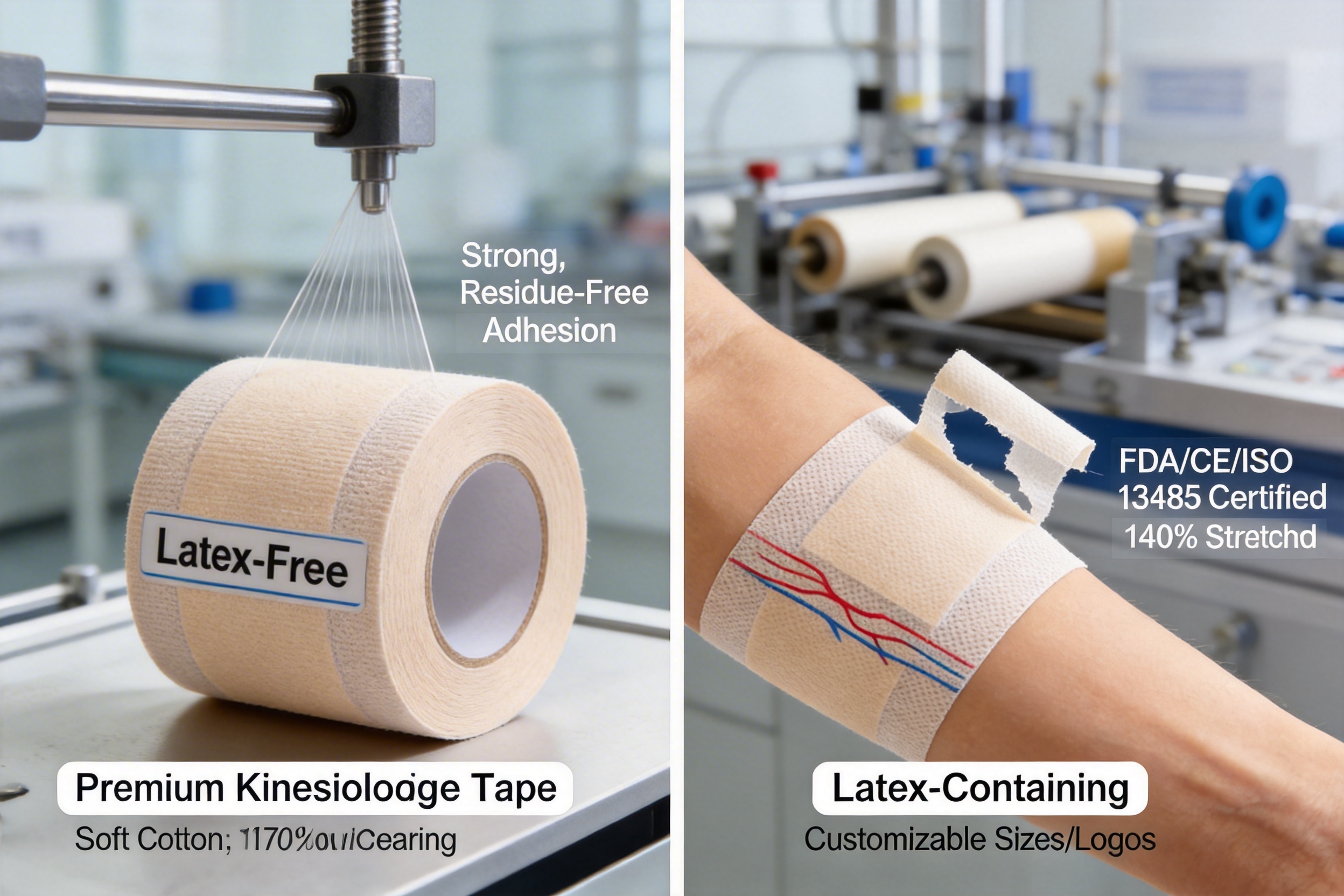 Generic tapes often use cheap synthetic materials that cause irritation and reduce performance. Premium tapes use 100% pure cotton and latex-free adhesive, ensuring comfort and safety for all users. This is particularly important for medical and sports customers who rely on the tape for long-term use.