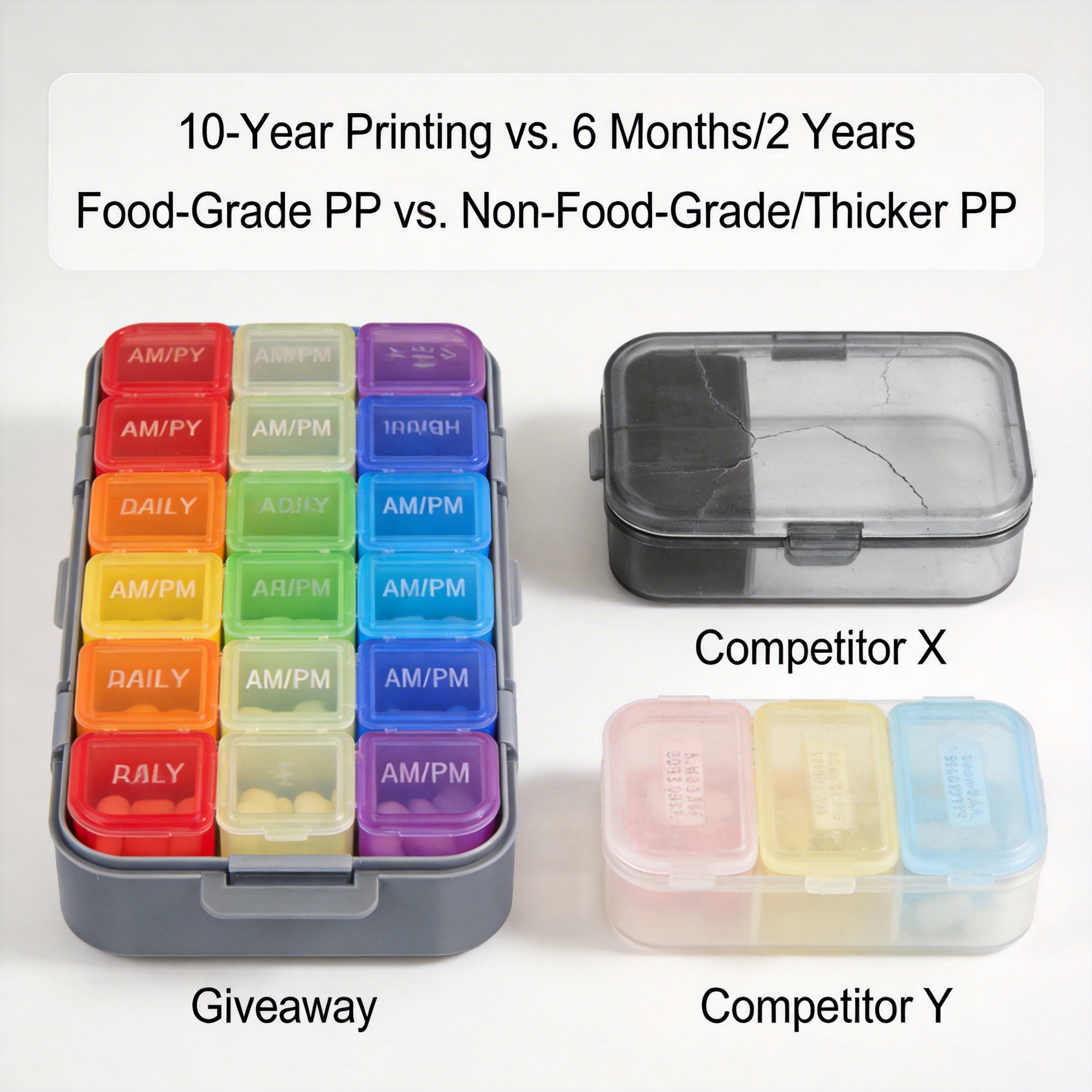 A common complaint about pill organizers is that the printing (days, AM/PM) rubs off after a few months of use, making the product unusable. The Giveaway organizer uses an upgraded printing process that’s tested to last up to 10 years, even with 100,000 uses. Competitors often use low-quality ink that fades within 6-12 months, forcing users to replace their organizers frequently.