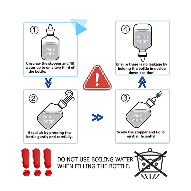 Grab the neck of hot water bottle. Fill in water slowly up to 2/3 full.