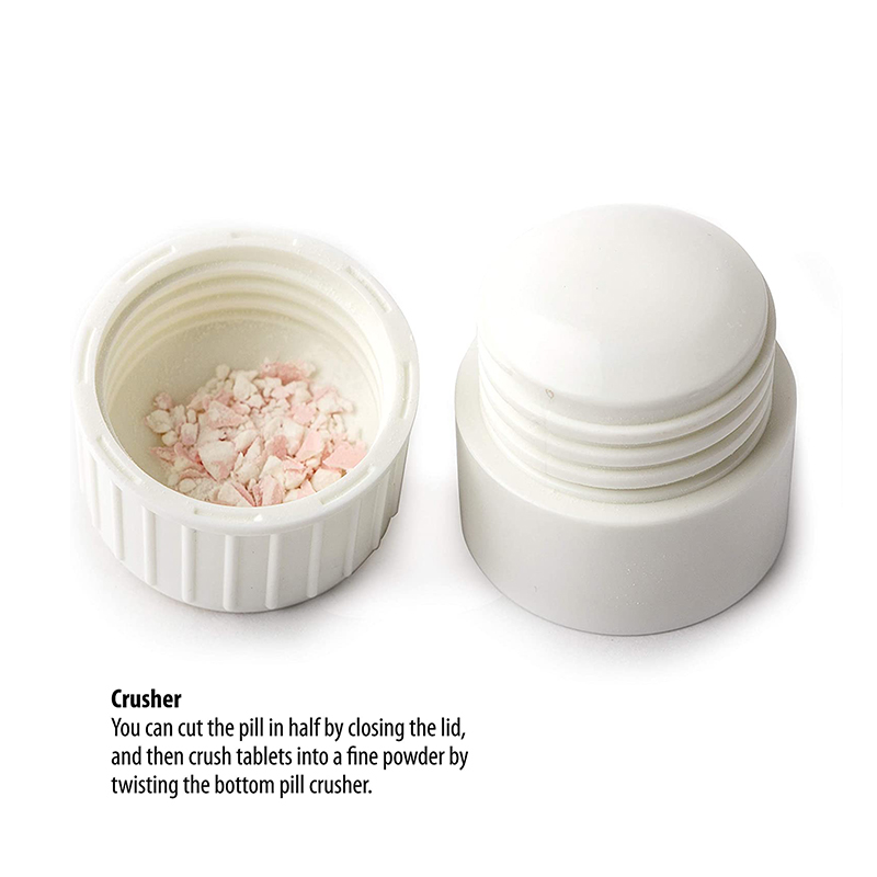 You can cut the pill in half by closing the lid, and then crush tablets into a fine powder by twisting the bottom pill crusher.
