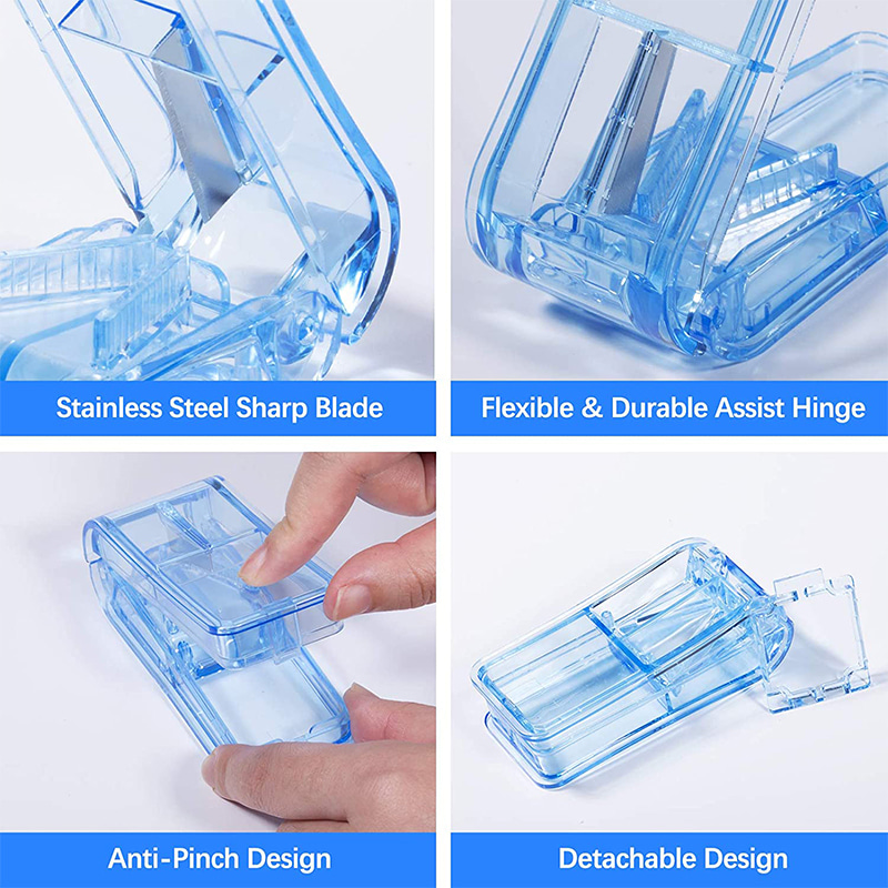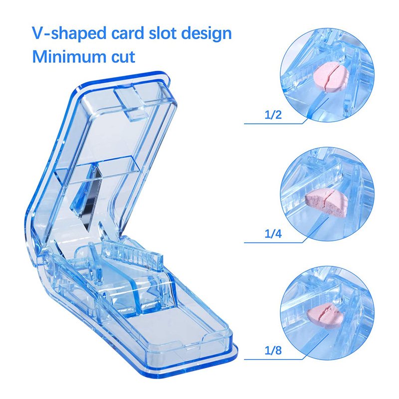 The pill cutter for small pills has a blade guard for safe cutting.
