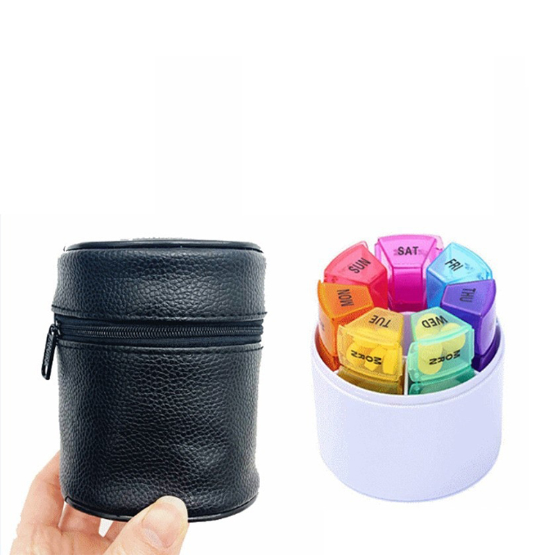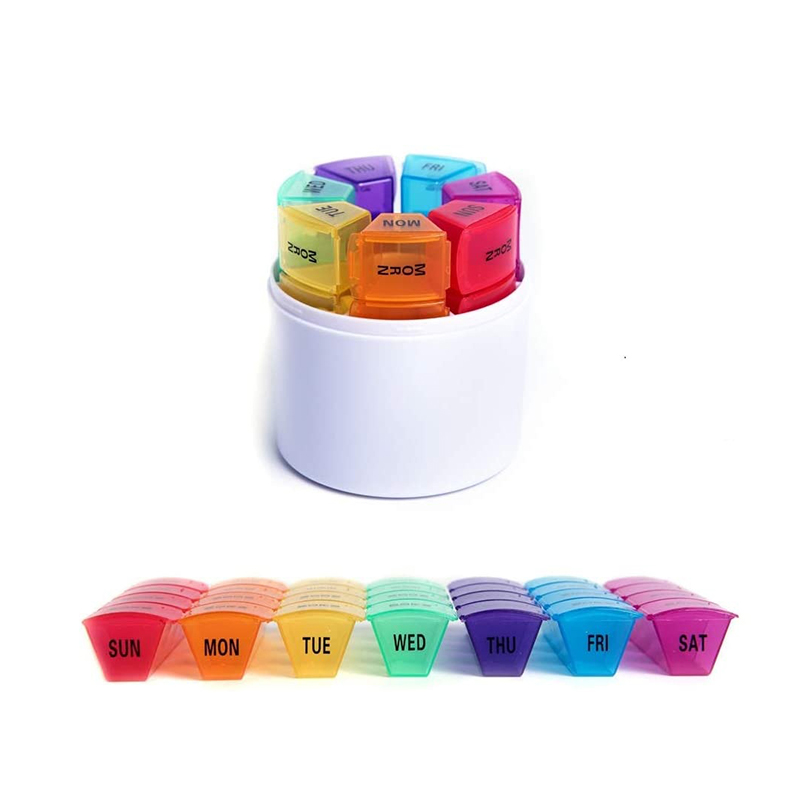 Each compact medicine box is printed with the week date and time icons, and each weekly pill box can be easily distinguished by 7 different colors.