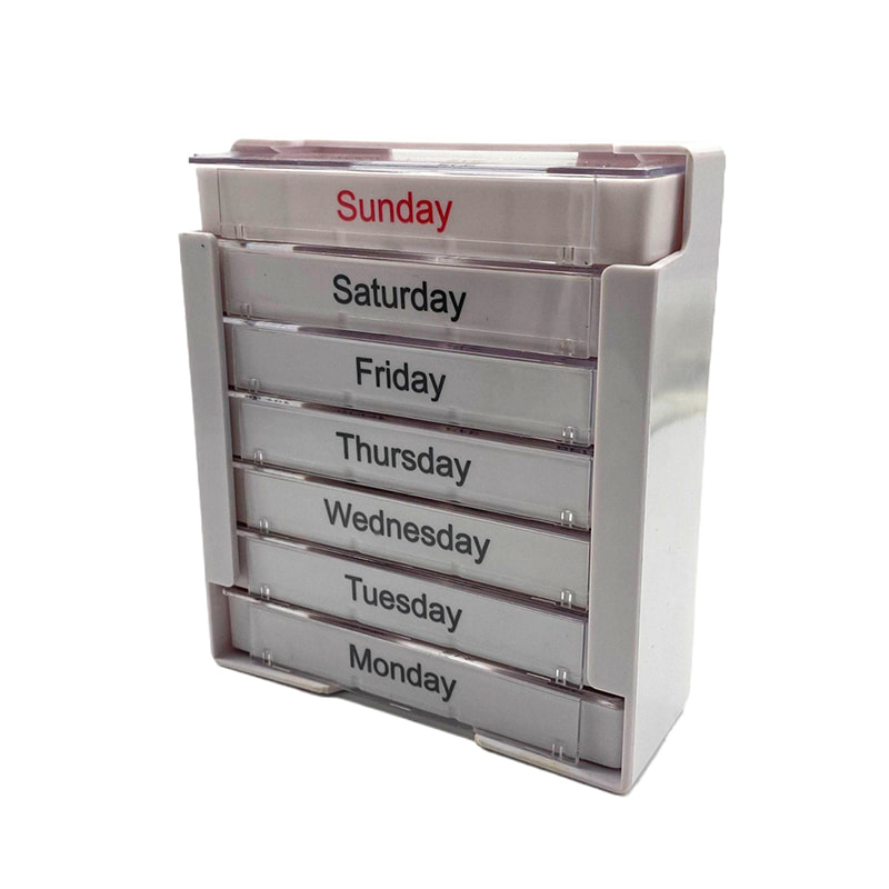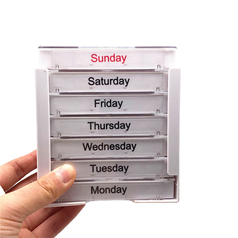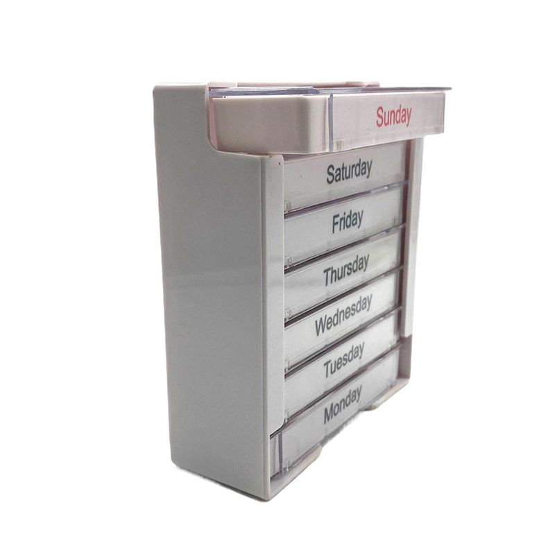 The outer case is designed transparent and each tray has unique bright color for the user to easily distinguish days of the week.