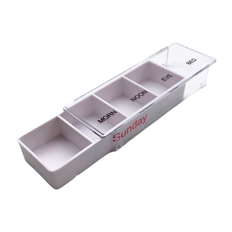 Each tray is dedicated for one weekday and has four compartments with morning, noon, evening and night label.