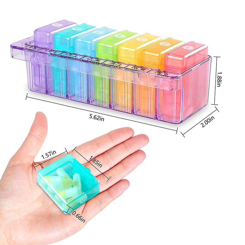 7 individual colorful pillboxes allow you to take one that you need for the day and place it in your purse or pocket.
