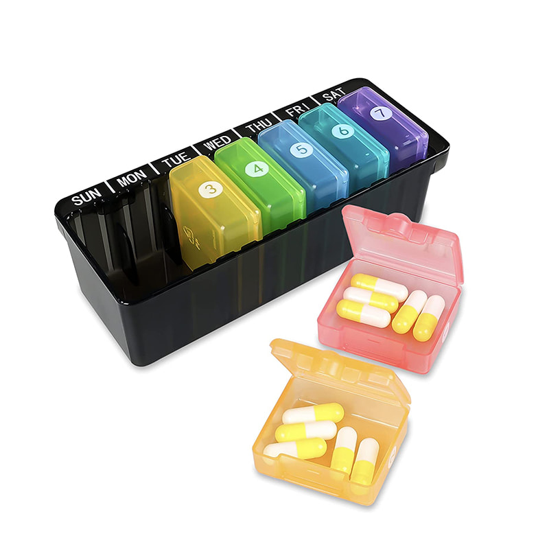 Our weekly pill organizer is compact but with enough capacity to store 6 fish oils, or 9 large vitamins, or 15 capsules for daily use.