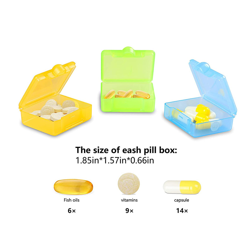 The daily pill box organizer's size is as big as a palm, can be put in your purse or pocket easily.