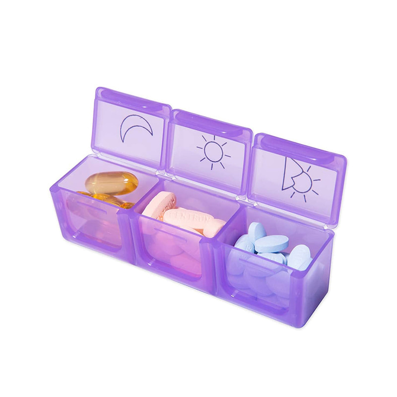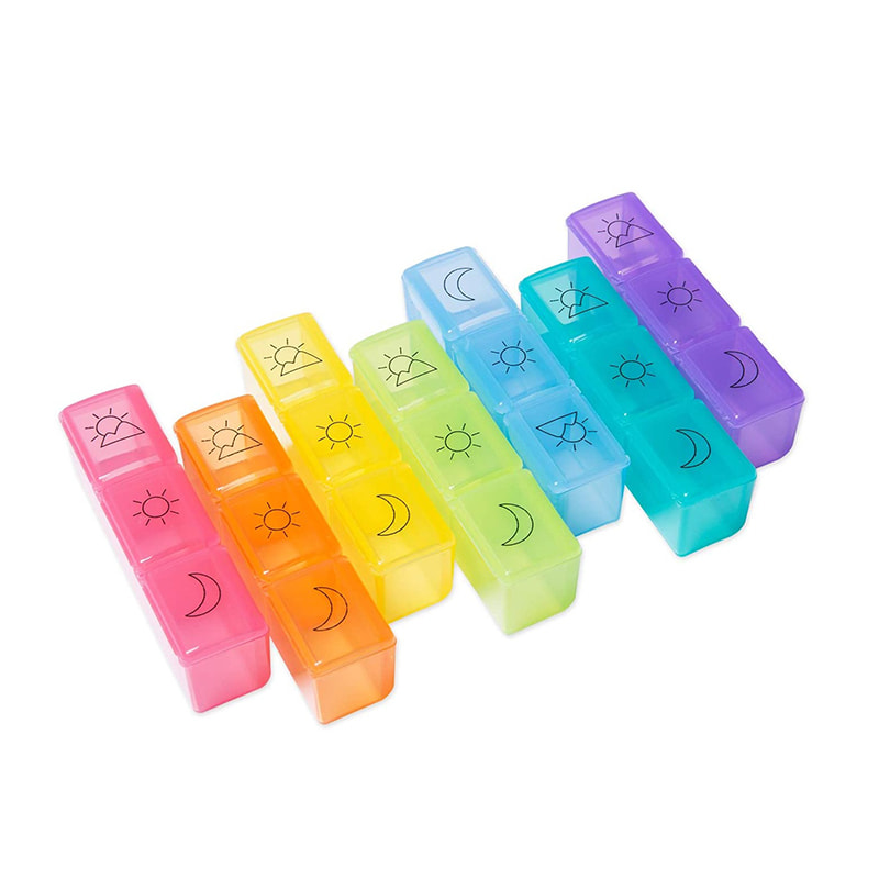 Each daily pill case is color coded, and designed with 3 compartments - morning, noon, night.