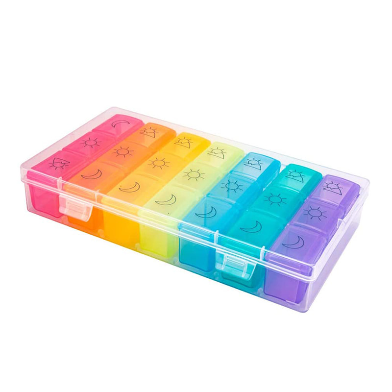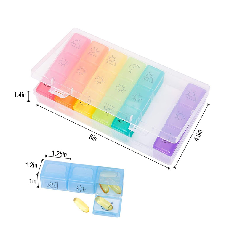 Bright color of the individual inner pill box corresponds to one day of the week