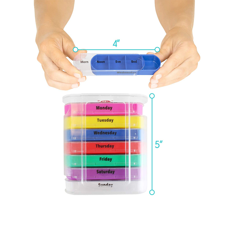 The outer case is designed transparent and each tray has unique bright color for the user to easily distinguish days of the week.