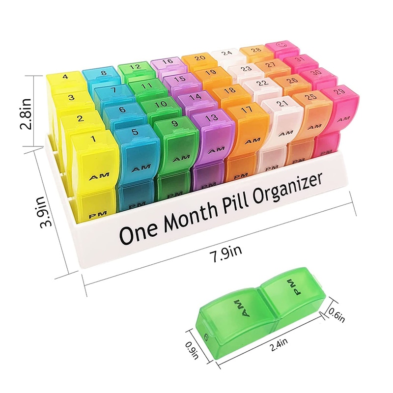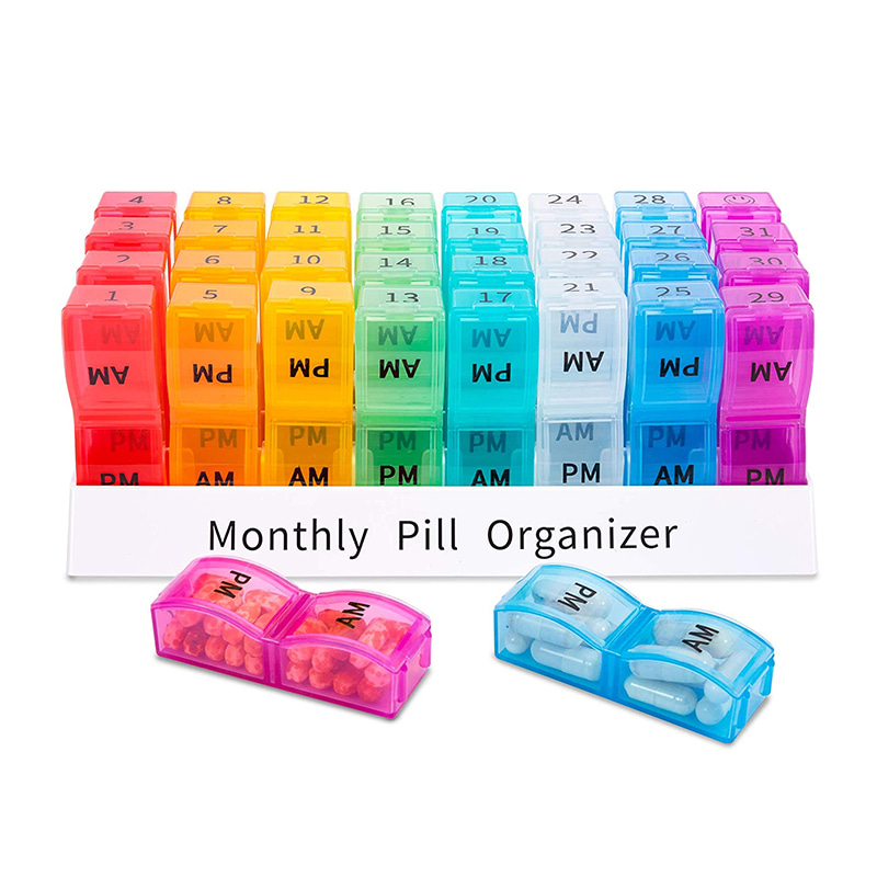 Our 31 day monthly pill organizer features 32 numbered bright and colorful translucent individual pill cases you will be able to check to see if you have taken your pills for the day and that way you won't have to keep multiple pill boxes.