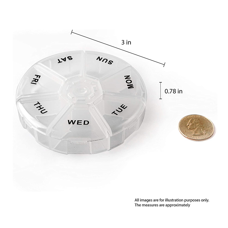 This pill organizer is only 3 inches, small enough to fit in your pocket! Made of rugged and durable translucent plastic.