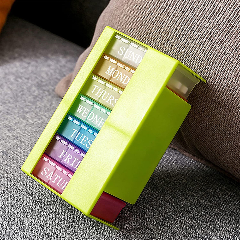 Each removable pill box has a pill box shelf. When you don't use the medicine box, the pill box shelf can store all the daily pill boxes neatly.