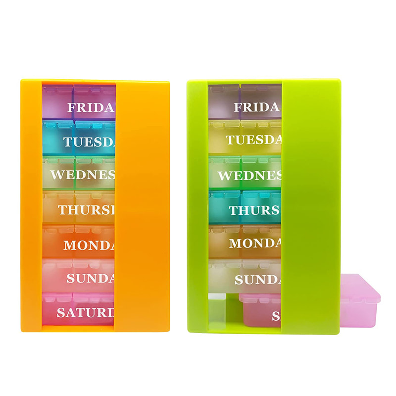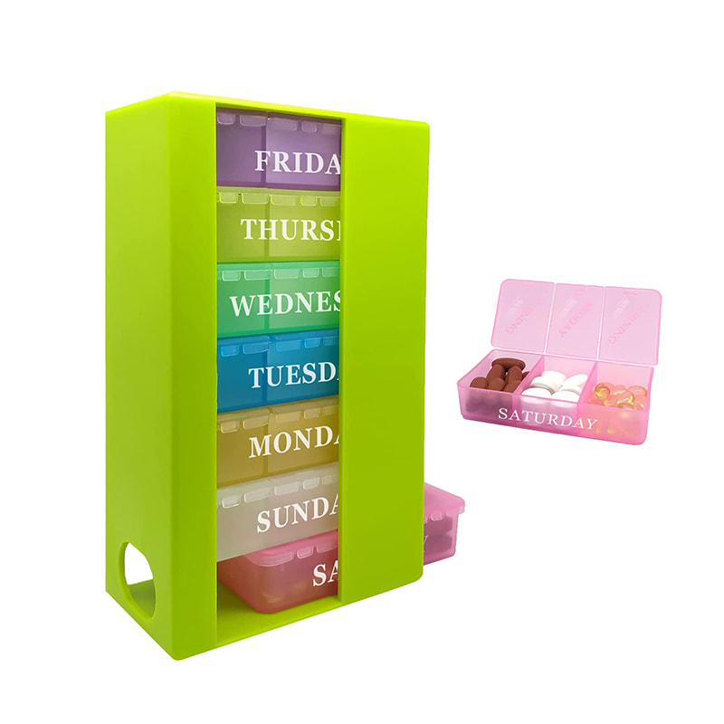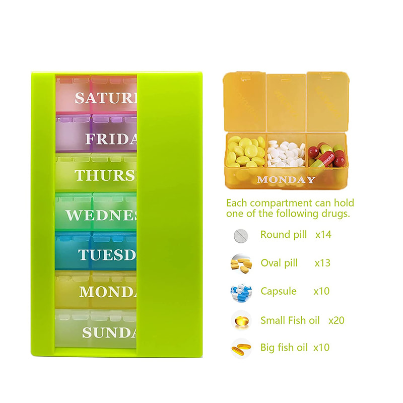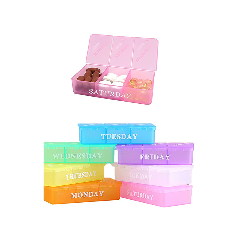 The pill manager three times a day has 21 compartments, with 7 different colors and day of week labels.