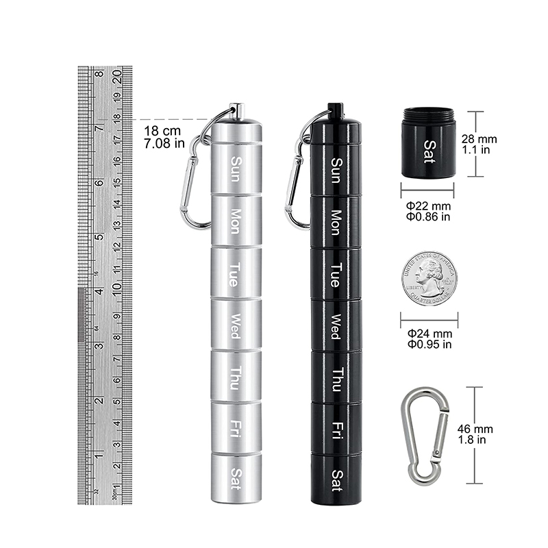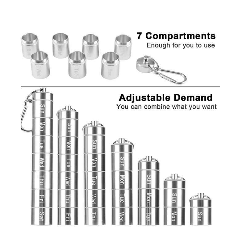 The weekly pill box are designed with 7 compartments, allow you to put the tablets dosage which you want in each compartment, in addition, the length can be adjusted based on your own needs