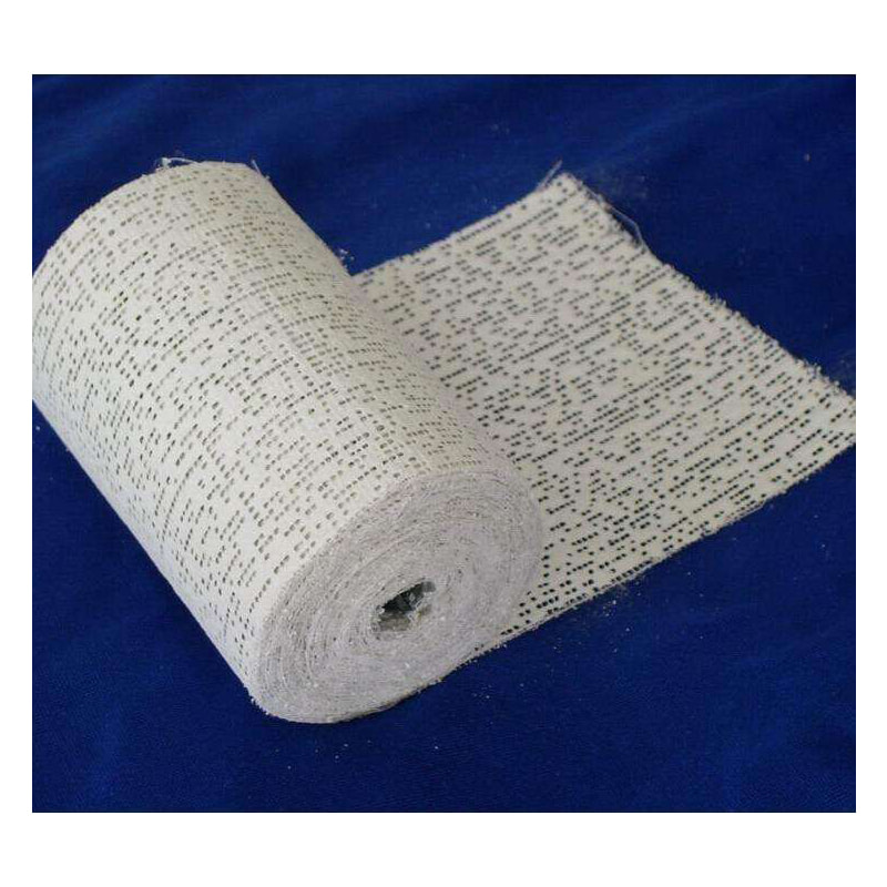Consists of plain-weave gauze fabric coated with blend of alpha and beta calcium sulphate crystals, spooled on round perforated plastic core.