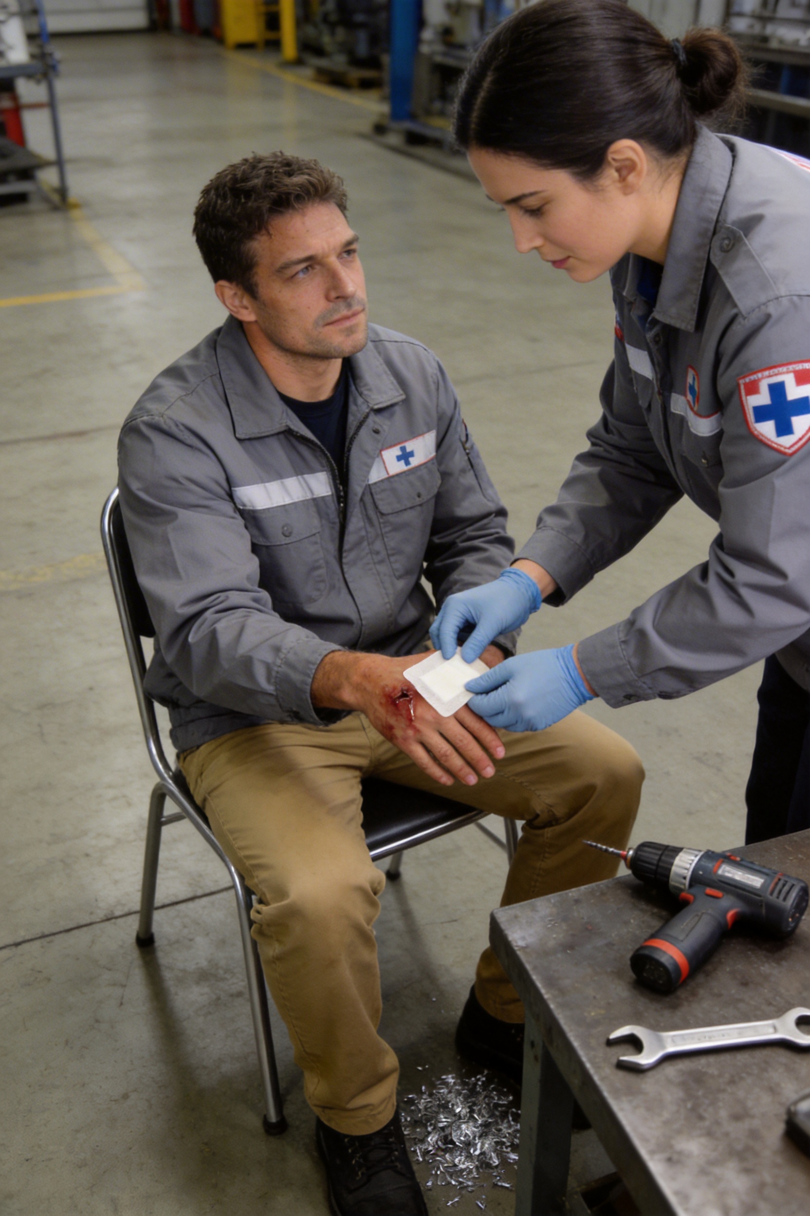 A factory worker is using a power tool and accidentally cuts his hand, with a puncture wound that is contaminated with metal shavings. The factory’s first aider uses the 12x10cm ambulance dressing, which is sterile and covers the wound completely. The dressing prevents further contamination, and the worker is transported to the hospital where the wound is cleaned and sutured. The worker does not develop an infection and is able to return to work in three weeks—avoiding the long-term complications that can arise from contaminated wounds.