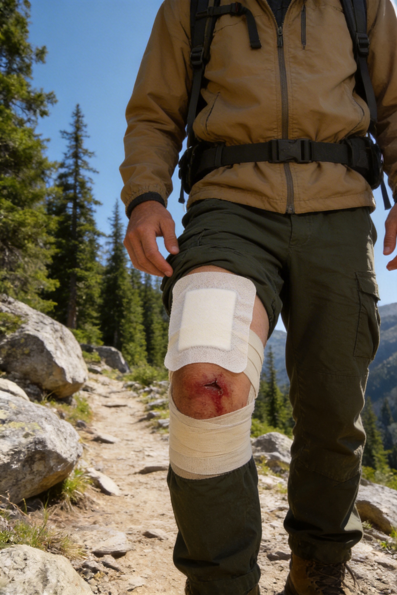 A hiker falls while trekking in a mountainous area and sustains a large abrasion on his knee. The hiker’s first aid kit contains an ambulance dressing, which he uses to cover the wound. The dressing stays in place during the 2-hour hike to the nearest clinic, preventing dirt and debris from entering the wound. The hiker’s wound heals without infection, and he is able to resume hiking in a month.